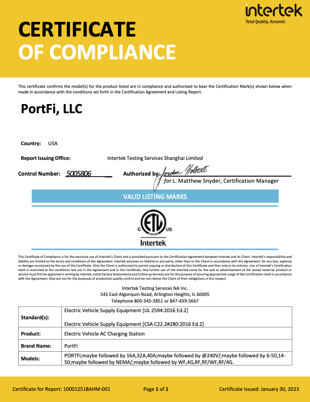 - ETL safety certified to UL2594, UL2231-1/-2, CSA C22.2#280 standards; FCC certified